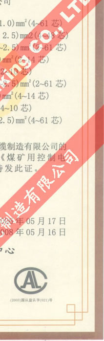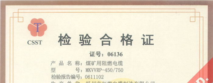 國(guó)家采煤機(jī)械質(zhì)量監(jiān)督檢驗(yàn)中心檢驗(yàn)合格證--煤礦用阻燃電纜(MKVVRP-450/750)