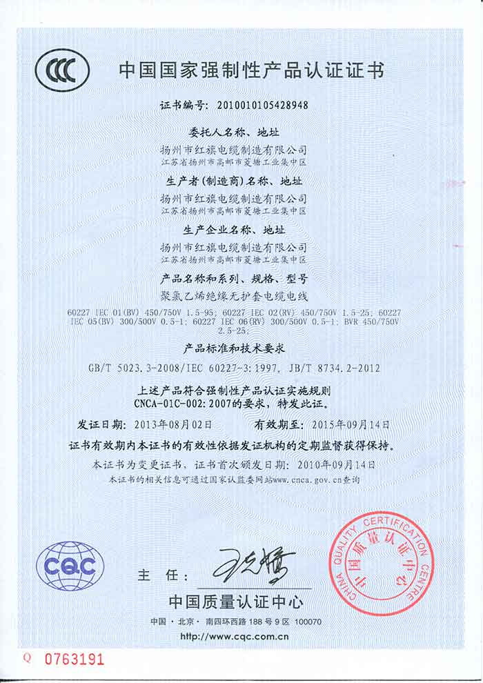產(chǎn)品“CCC”安全認(rèn)證證書(聚氯乙烯絕緣無護(hù)套電纜電線)