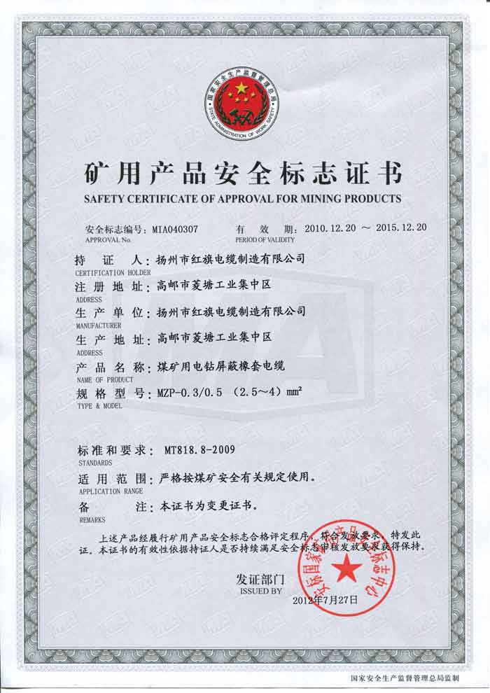 煤礦礦用產(chǎn)品安全標(biāo)志證書(shū)-MZP
