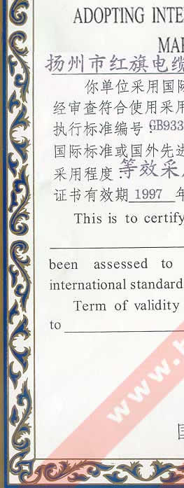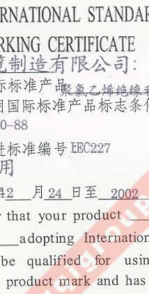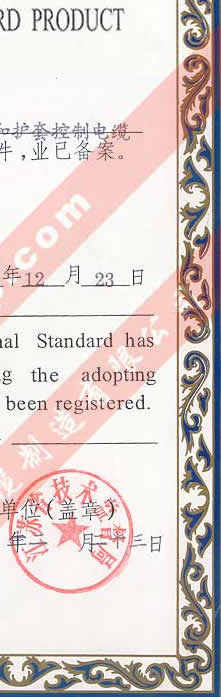 國家技術(shù)監(jiān)督局采用國際標(biāo)準(zhǔn)證書(聚氯乙烯絕緣和護(hù)套控制電纜)