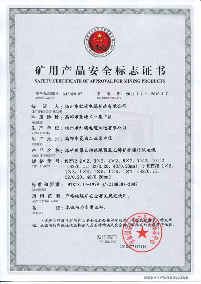 煤礦礦用產(chǎn)品安全標志證書-MHYVR