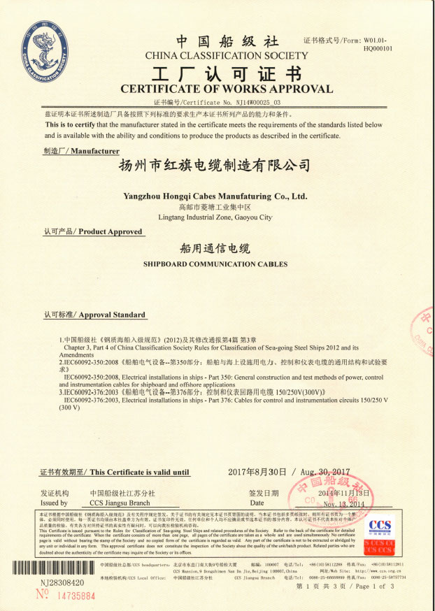 中國船級社工廠認(rèn)可證書(船用通信電纜)