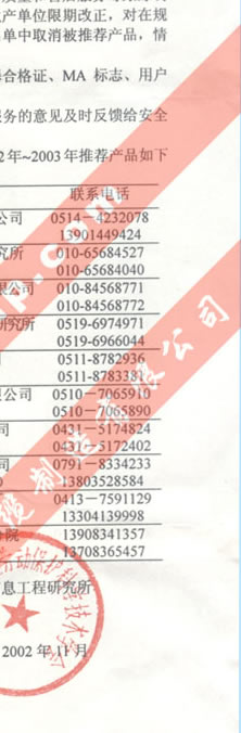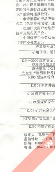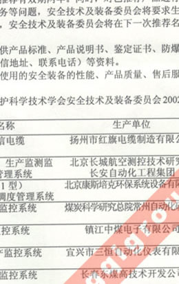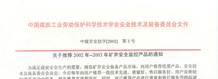 中國(guó)煤炭工業(yè)勞動(dòng)保護(hù)科學(xué)技術(shù)學(xué)會(huì)安全技術(shù)及裝備委員會(huì)推薦2002-2003年礦井安全監(jiān)控產(chǎn)品的通知(我公司生產(chǎn)的礦用信號(hào)、通信電纜排名第一位)