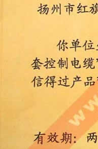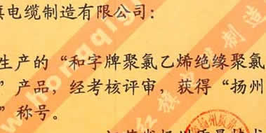 揚州市質(zhì)量信得過產(chǎn)品稱號證書(和字牌聚氯乙烯絕緣聚氯乙烯護套控制電纜)