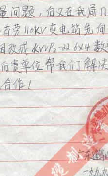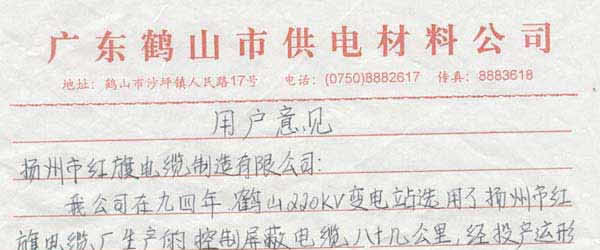 廣東鶴山市供電材料公司對(duì)我公司產(chǎn)品質(zhì)量和幫助解決工程設(shè)計(jì)問題的贊譽(yù)