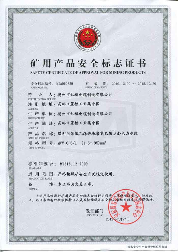 煤礦礦用產(chǎn)品安全標(biāo)志證書-MVV