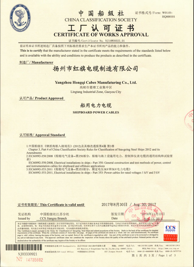 中國(guó)船級(jí)社工廠(chǎng)認(rèn)可證書(shū)(船用電力電纜)