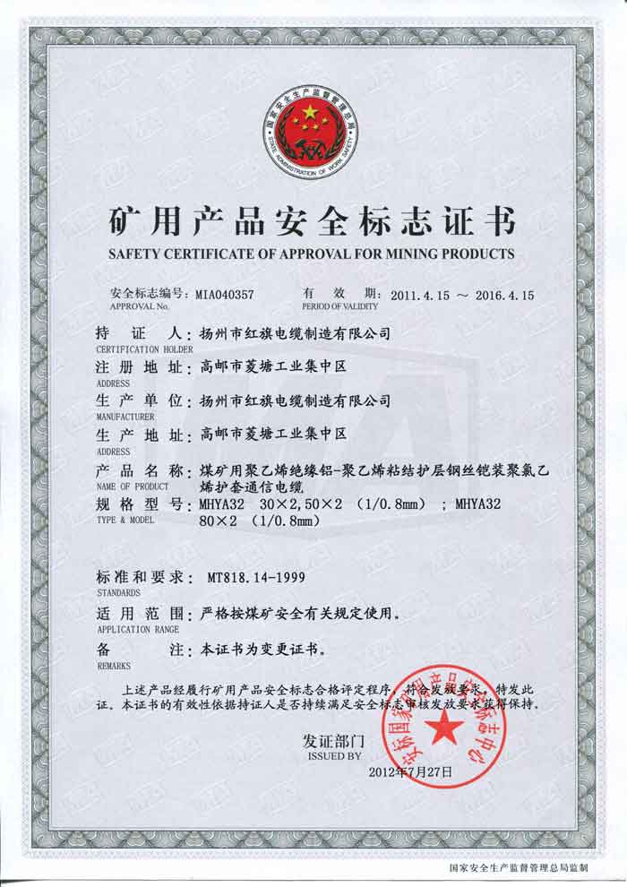 煤礦礦用產(chǎn)品安全標(biāo)志證書-MHYA32
