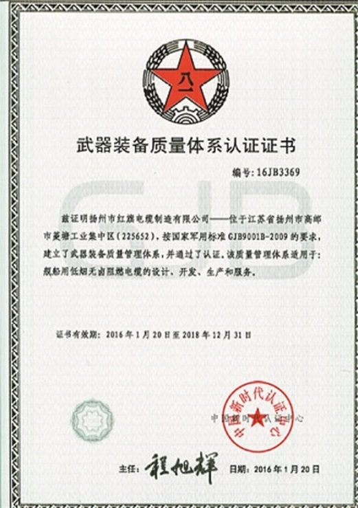 熱烈祝賀揚(yáng)州紅旗電纜公司取得武器裝備質(zhì)量體系認(rèn)證證書